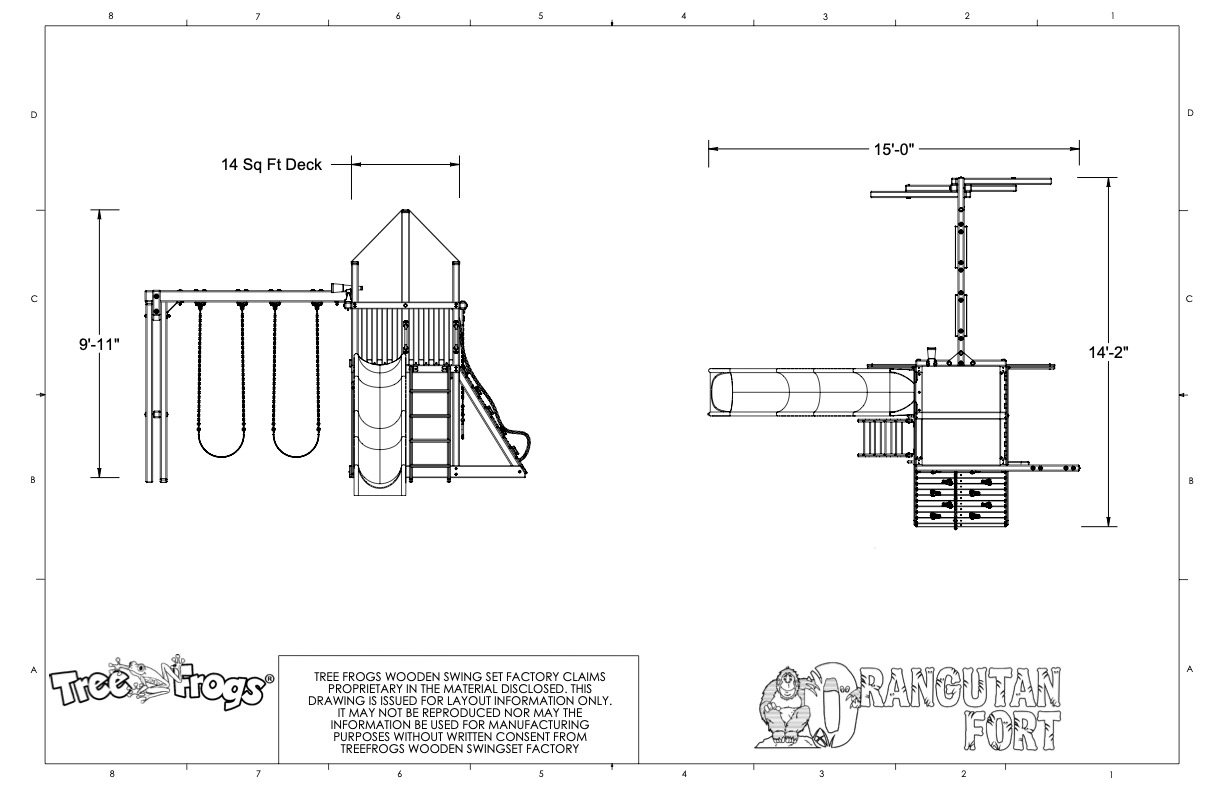 The Orangutan Fort Swing Set is one of our most popular models. All of our play sets are built with chemical free lumber that is naturally insect and pest deterrent. This set features 48″ raised 14 sq. ft. playground set deck, double wall wave slide, a full width rock wall with 10 climbing rock holds and a climbing rope, trapeze with rings and 2 belt swings with rubber plastisol coated chains, telescope, ships wheel, and a green tarp roof that shades the sandbox below. With so many fun features, your child is sure to enjoy this set for years to come.