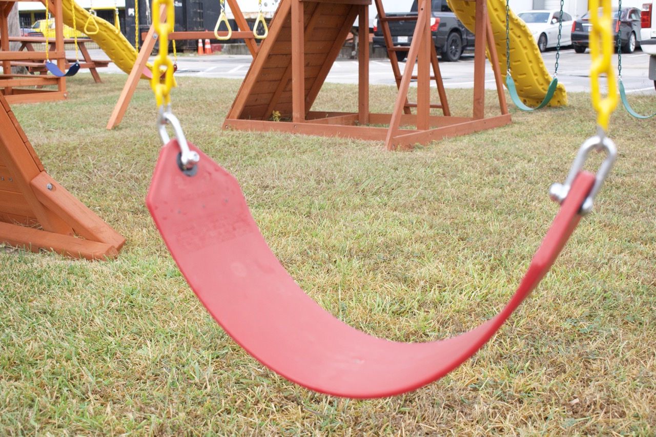 Our swing sets are well-constructed, with no dangerous metal protrusions, and are even strong enough to support heavy adults. Our support gussets are one piece of timber that is notched for superior strength. We recess our hardware for safety and to keep the play set looking beautiful. Your strong, beautiful play set will last for years outdoors and hold a special place in your kid’s memories for life. Our standard swing beams are constructed of 4×6 solid lumber, never laminated. Built for years of sturdy, safe play.