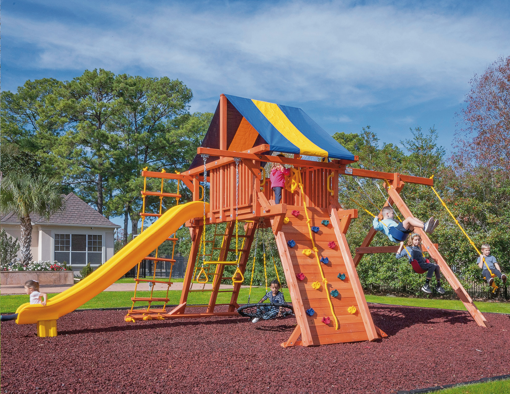 Tree Frogs playlets are designed with safety as our priority. We want our customers to have peace of mind that what they are investing in is as safe as possible. Every swing set is made with recessed hardware and smooth wood, as well as coated chains so fingers don’t get pinched.